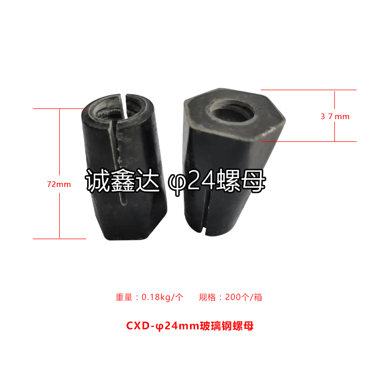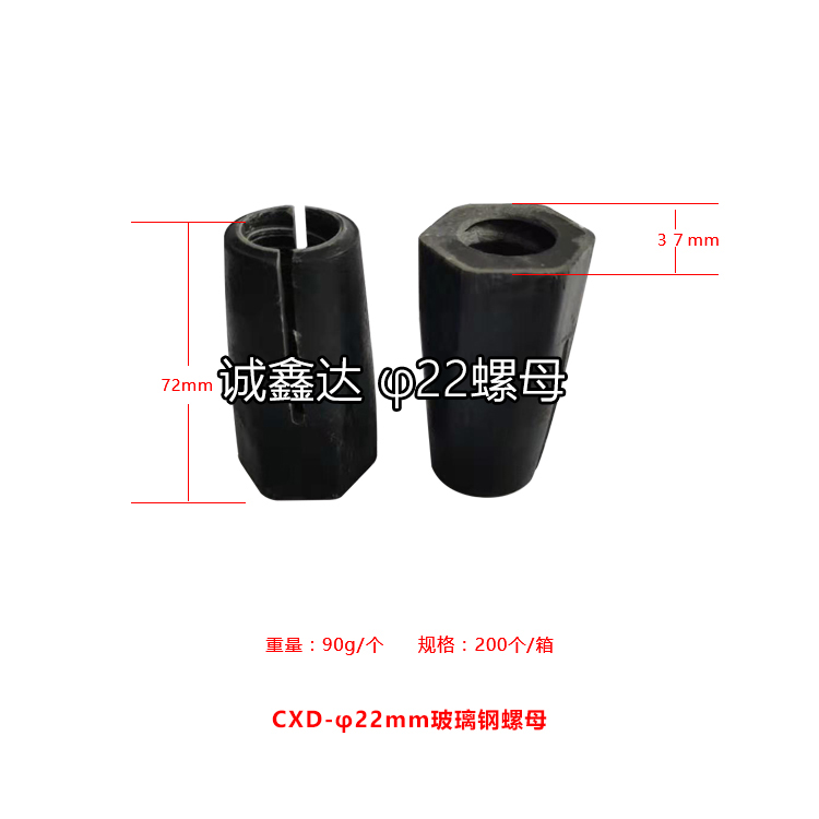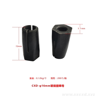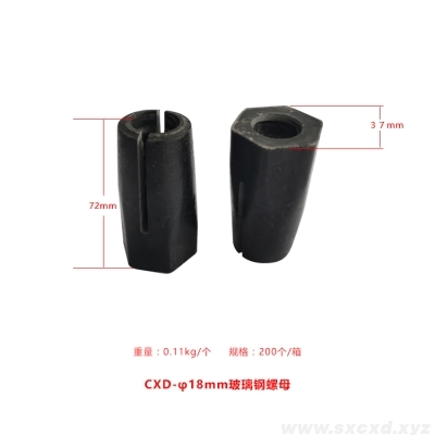 作為礦山支護(hù)配件,山西誠鑫達(dá)研發(fā)了一種高抗拉強(qiáng)度的玻璃鋼螺母,螺母本體開有內(nèi)螺紋孔,在內(nèi)螺紋孔孔壁設(shè)螺紋,螺母本體的前部分外形為錐形且用于與托盤緊密配合,在螺母本體的前部分的錐形面開設(shè)有通槽,螺紋孔的前部呈喇叭形,這樣螺紋孔的前端直徑大于后端的直徑,進(jìn)入托盤錐形孔后,螺母本體的前端和中部同時收縮,使螺母本體的內(nèi)螺紋與錨桿外螺紋緊密配合,拉緊長度增加到25mm—30mm,擴(kuò)散了應(yīng)力,使抗拉強(qiáng)度明顯提高。